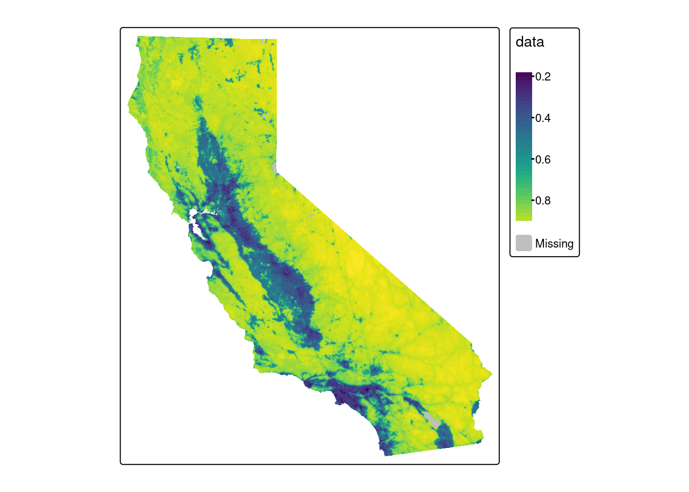 Aside from drowning in acronyms, this task provides a great chance to apply the same tools seen in our intro at a larger spatial scale. We will average the rasterized 100m projections from the BII over each of the 63,890 polygon tiles used in the CDFW data. Even though we are now dealing with a raster layer that involves a very derived product (BII) from a different provider (Planetary Computer), and a much larger set of polygons from a different source and in different scale and projection, the process is almost identical to the intro example.
