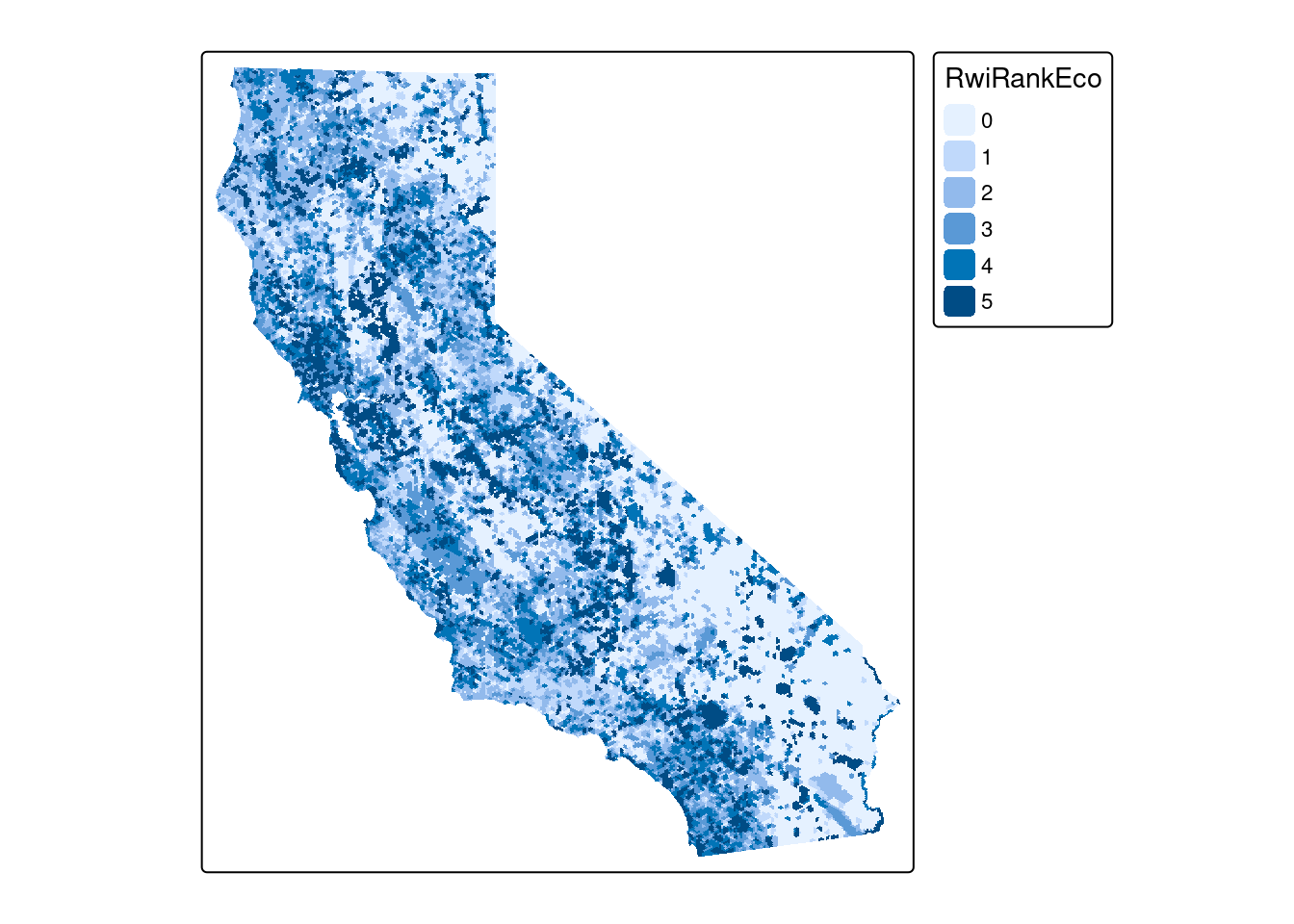 url <- "/vsicurl/https://minio.carlboettiger.info/public-biodiversity/ACE_summary/ds2715.gdb"ace <- st_read(url) tm_shape(ace) + tm_polygons(fill = "RwiRankEco", col=NA)